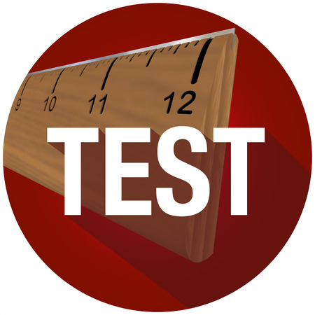 51060163 – test word with long shadow over a wooden ruler to illustrate measuring in an experiment or evaluation